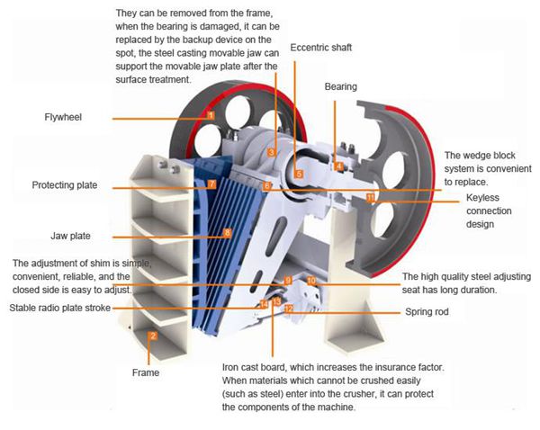 The Jaw Crusher is drived by motor through belt and belt wheels,which makes the movable jaw plate up and down through eccentric shaft.When the movable jaw comes down,the angle between the fixed jaw plate and the movable jaw plate gets smaller,Then the materials can be crushed .When the movable jaw plate rises,the angle becomes lauger and the movable jaw plate leaves the fixed jaw plate with the function of tie bar and spring.At the same time the final products are discharged from the lower outlet of the crushing chamber.